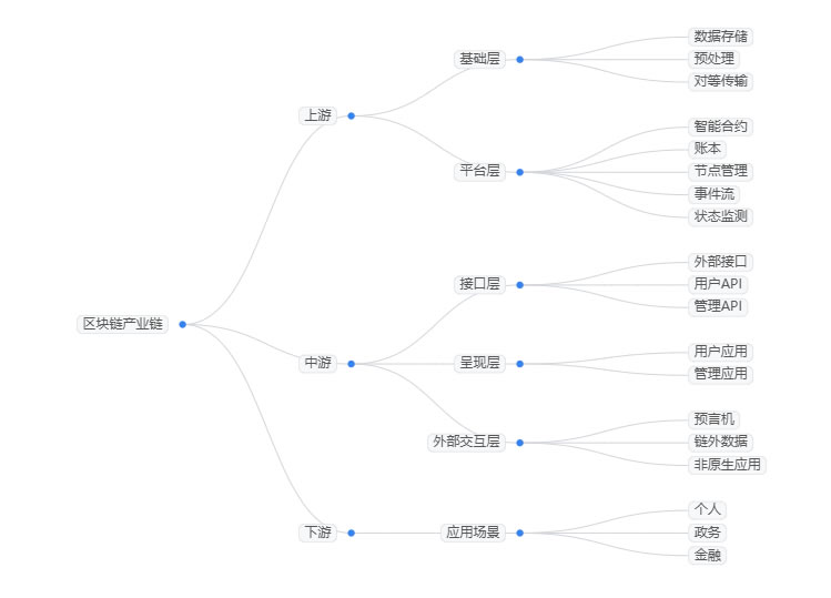 区块链技术在政务服务与工业生产中的应用,打破了信息壁垒,实现了资产数字化与治理模式革新,为区块链行业高质量发展注入新动能。区块链产业链上游主要为基础层与平台层,基础层包括数据存储、预处理与对等传输;平台层包括智能合约、账本、节点管理、事件流与状态监测等。产业链中游为接口层、呈现层与外部交互层,接口层包括外部接口、用户API与管理API;呈现层包括用户应用和管理应用;外部交互层包括预言机、链外数据与非原生应用。产业链下游为应用场景,包括个人、政务与金融等。