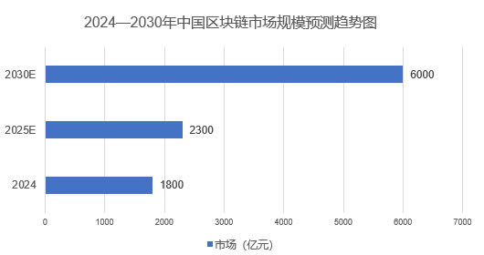 传统金融服务面临结算周期长、合规成本高、普惠性不足等问题,区块链技术通过智能合约与分布式架构,推动金融服务向高效、合规、普惠转型。中国区块链市场展现强劲增长势头,2024年市场规模已突破1800亿元,《2025-2030年中国区块链产业运行态势及投资规划深度研究报告》预计2025年将达2300亿元以上,未来五年复合年增长率有望维持在 25% 左右,至2030年整体市场规模或将突破6000亿元。