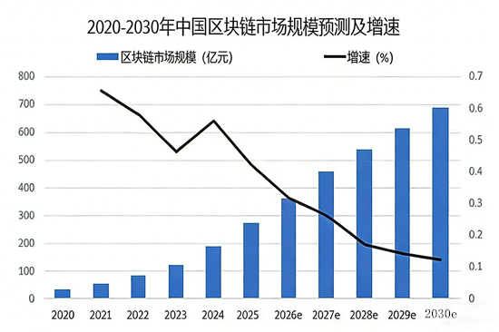 从市场规模来看,2019-2022 年中国区块链市场保持高速增长态势,。展望未来,随着技术融合与合规场景落地,市场规模将重回增长轨道,预计 2025 年达到 275 亿元,2030 年进一步攀升至 691.2 亿元,成为数字经济增长的重要引擎。
