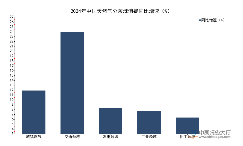 我国能源结构转型进程中,天然气作为煤炭清洁替代的核心品种,需求规模持续扩张,叠加城镇化率持续提升,城镇燃气普及范围不断扩大,推动整体消费保持稳定增长。2024年国内天然气表观消费量达到4260.5亿立方米,同比增速达到近8%,较上年提升0.7个百分点,增长动能逐步企稳。不同应用领域的增长速度存在明显分化,城镇化带动城镇燃气需求持续扩张,交通领域“油改气”推广推动用气需求快速增长,工业领域则随产业结构调整保持平稳增长态势。为清晰呈现分领域增长特征,整理核心数据如下: