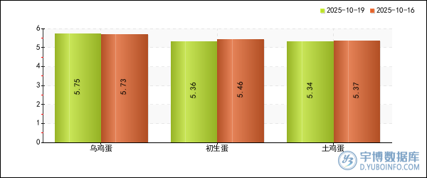宇博智业监测数据显示,2025年10月19日,全国79类鸡蛋中,仅有乌鸡蛋的价格出现了上涨,涨幅为0.35%,当日报价为5.75元/斤。