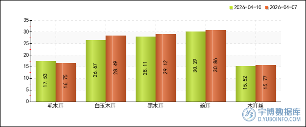 宇博智业监测数据显示,2026年04月10日,全国33类木耳中,仅有毛木耳的价格出现了上涨,涨幅为4.6%,当日报价为17.53元/斤。
