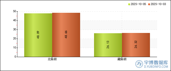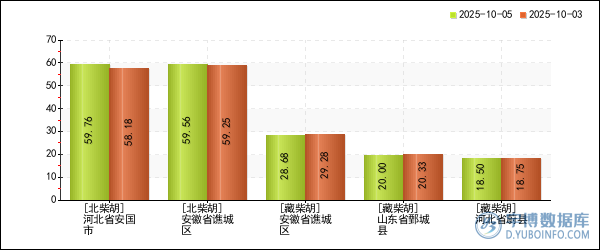 宇博智业监测数据显示,2025年10月05日河北省安国市地区的北柴胡价格涨幅最大,涨幅为2.72%,报59.76元/斤(2025年10月03日价格报58.18元/斤)。安徽省谯城区地区的藏柴胡价格跌幅最大,跌幅为2.05%,报28.68元/斤(2025年10月03日价格报29.28元/斤)。